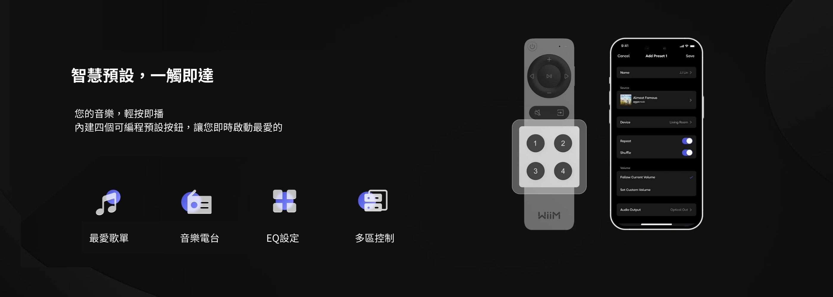 - 智慧預設:4 組預設歌單,最愛歌單一鍵直達