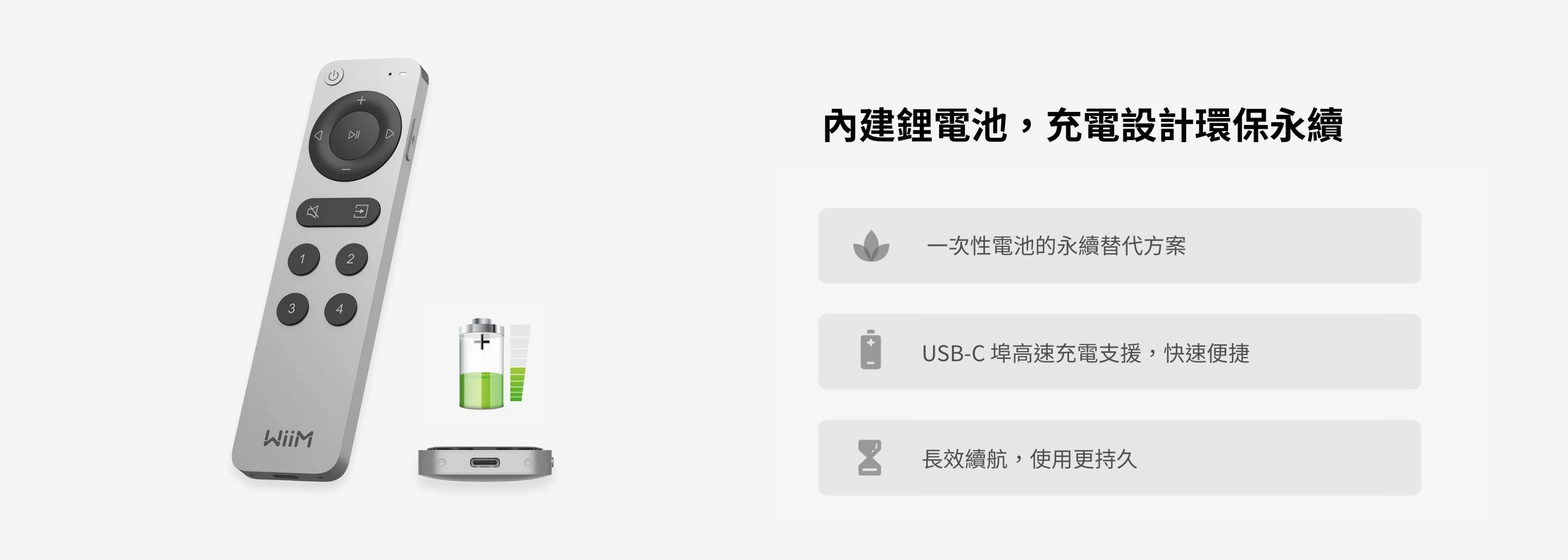 WiiM Voice Remote 2 採用長效充電電池,無需使用拋棄式電池。視使用情況而定,單次充電通常可持續使用數週。此遙控器支援 USB-C 快速充電,確保電力回補既快速又方便。