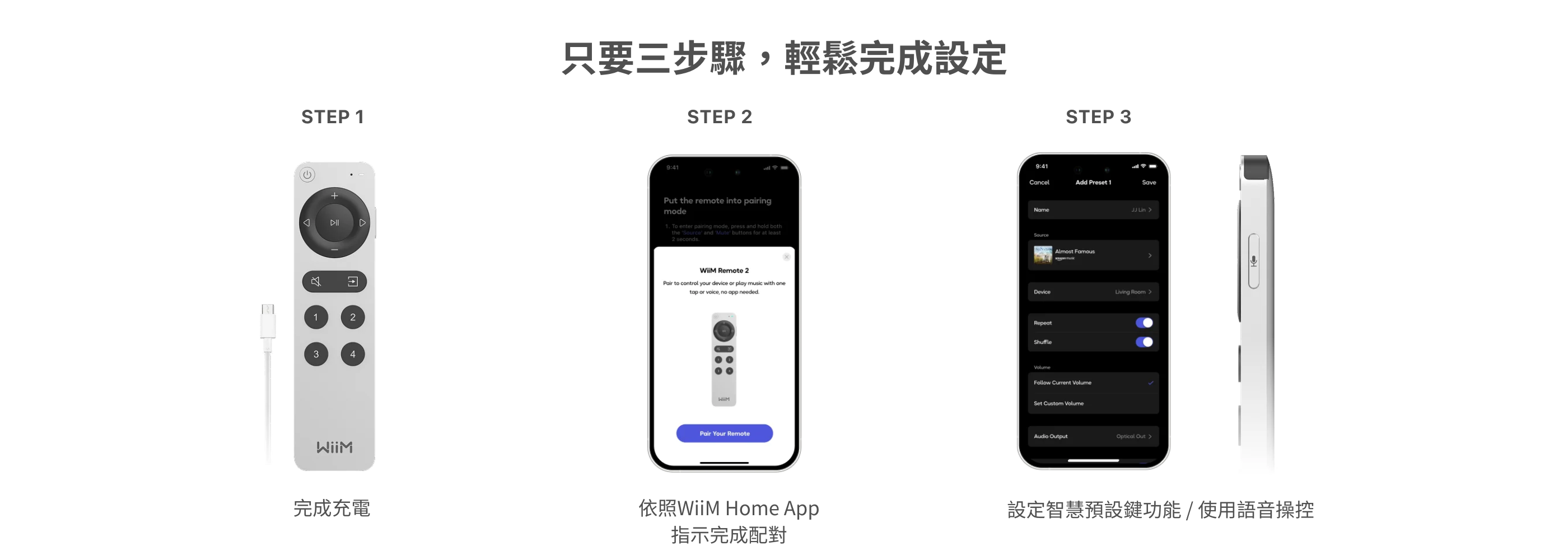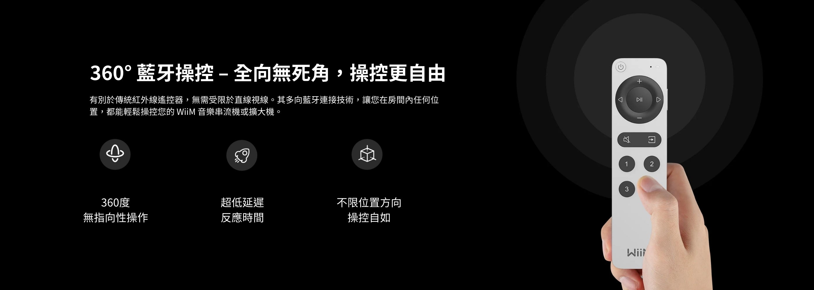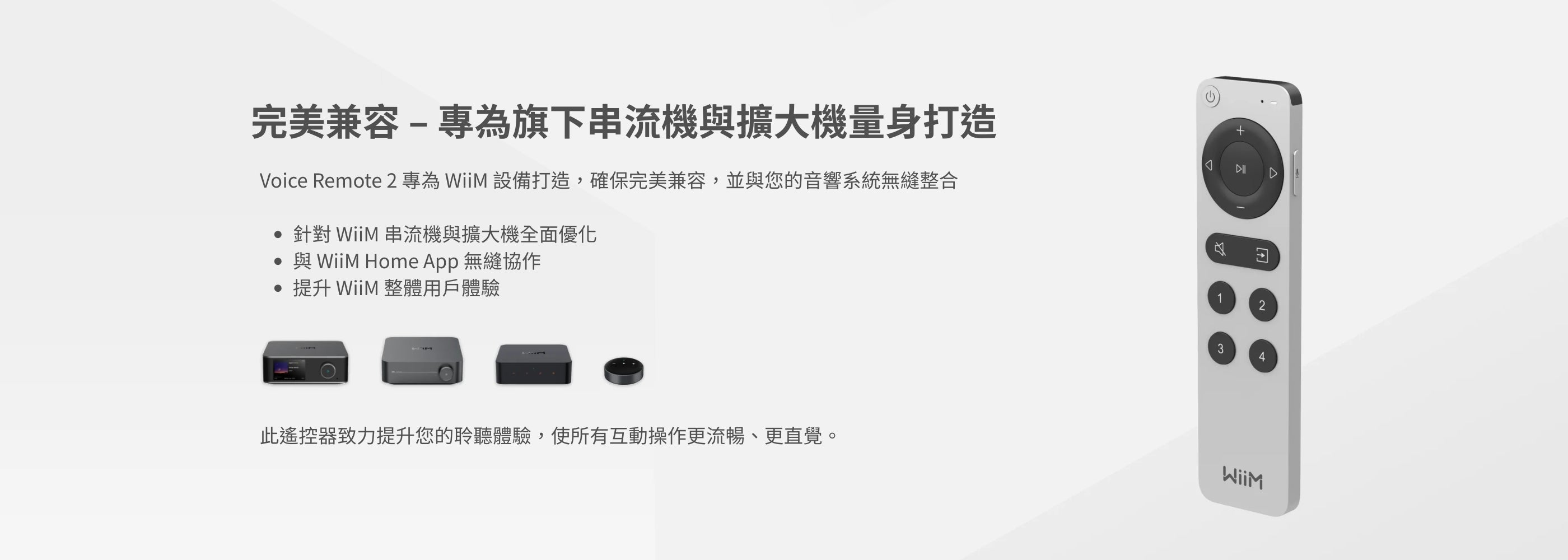 WiiM Voice Remote 2 是專為 WiiM 產品(包含 WiiM 音樂串流機及擴大機)獨家設計的。它無法與其他智慧家庭設備(例如電視、聲霸或非 WiiM 的音響設備)搭配使用。