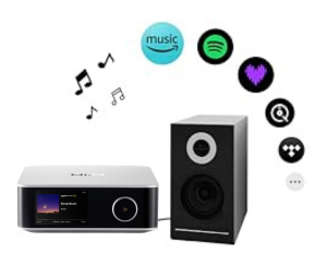 您可以透過 WiiM Home 應用程式或您喜歡的播放協議,從 KKBOX, Spotify、TIDAL、Qobuz、Amazon Music、Deezer、Pandora、TuneIn、SoundCloud、iHeartRadio 等平台播放音樂。