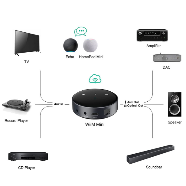 WiiM Mini非常易於設置,支援高解析度WiFi音頻串流。它支援使用Apple Airplay 2和Spotify/TIDAL Connect播放音頻內容,而且能夠與其他Airplay 2或Alexa設備組合,打造無線多房間聽覺享受。它還通過其易於使用的設備伴侶App支援流行的音樂串流服務。另外,它還支援模擬音頻輸入,可以讓您在多個設備上聆聽您的音頻設備。WiiM Mini是行業中最優秀的選擇,無論是音頻品質還是使用體驗,都無與倫比!