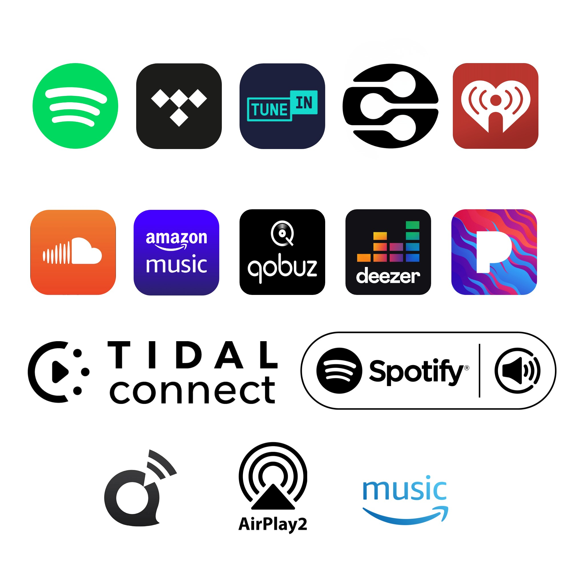 GoogleCast Audio, Spotify Connect, Tidal Connect, KKBOX, Alexa, Roon Ready, Qobuz, DLNA, Airplay2