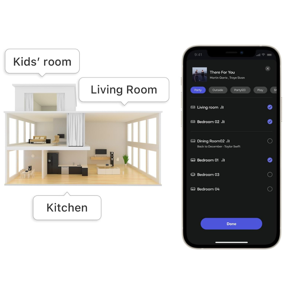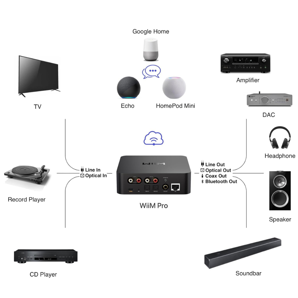 通過HomePod、Google Home、Alexa設備或多個WiiM設備輕鬆搭建您的多房間音響系統,並同時播放到多個音頻設備。WiiM Pro支持來自各種音頻源輸入的多房間音頻功能,包括WiFi、藍牙或Aux/SPDIF輸入。使其幾乎與每種音樂聆聽選項兼容。