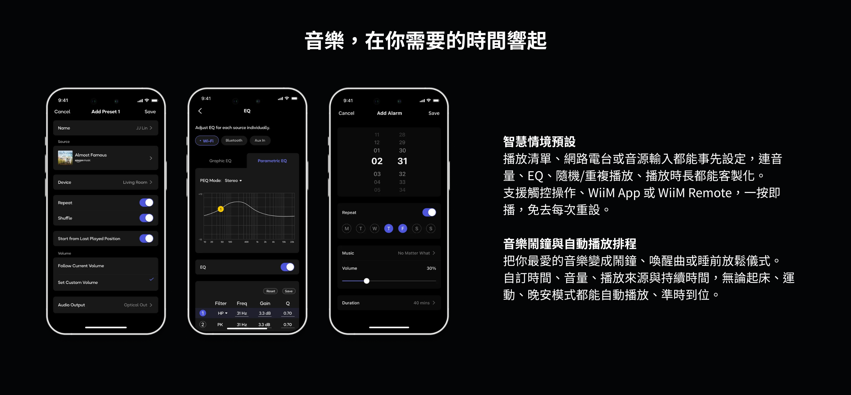 調音功能:AI RoomFit™、10 段 EQ (Wi-Fi / Ethernet、Bluetooth、AUX 各音源可獨立 EQ 設定)